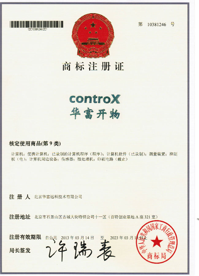 我公司于2011年11月向国家工商总局商标局提出controX商标申请,并于2013年4月正式取得注册证书。